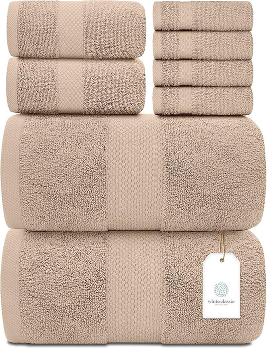 White Classic Luxury Bath Towel Set of 8 Pieces - 100% Turkish Cotton Highly Absorbent Towels for Bathroom, 2 Luxury Bath Towels 700GSM, 2 Hand Towels, 4 Washcloths, Taupe