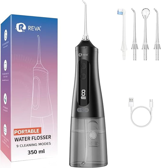 Reva Professional Water Dental Flosser for Teeth & Braces - 9 Modes Cordless Oral Irrigator, 350ML Large Reservoir, 360° Nozzle, IPX7 Waterproof, Rechargeable, Dental Floss Tool (M131 - Black)
