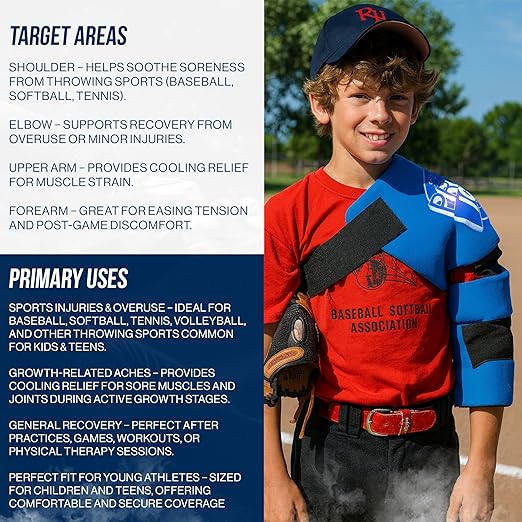 - THERAPEUTIC COLD THERAPY - Enjoy the benefits of cooling therapy directed at the affected shoulder and elbow areas to ease the pain of your kids. This targeted approach ensures that injuries like shoulder tendinitis, throwing injuries, and chronic instability receive the relief they deserve, promoting faster recovery and reduced swelling.