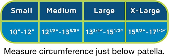 - SIZING: Measure circumference just below patella (knee cap). Small (10"-12"), Medium (121/8"-135/8"), Large (133/4"-15.5"), X-Large (155/8"-17.5"). If between sizes, order larger size.