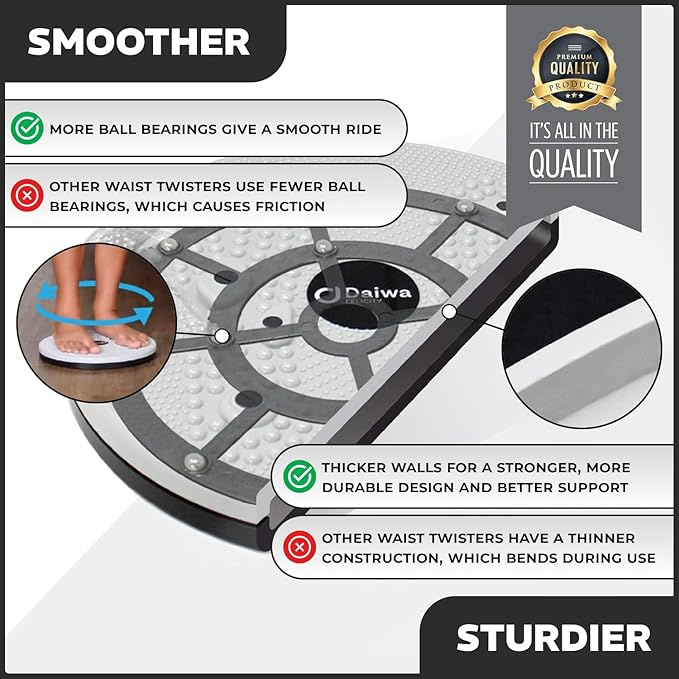 - Efficient calorie burning: The Daiwa Felicity waist and body twister for exercise offers a low-impact but highly effective workout that targets thighs, hips, back, and core. Its smooth platform, enhanced by additional ball bearings, allows friction-free rotation, making each move seamless. Experience faster calorie burn and improved cardiovascular health with every twist, transforming your fitness routine into a satisfying, effortless exercise session.
