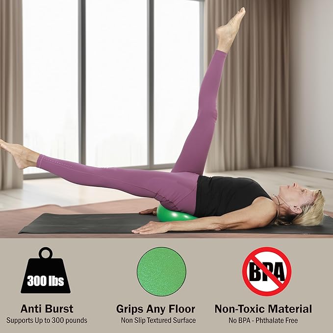 - [ High Quality ] This 9" Diameter small exercise ball is very durable, and is tested to support up to 300 Pounds. The non-slip surface grips to any flooring, including carpet, tile, hardwood, and laminate. The non-toxic PVC material is safe for skin and has been tested by independent labs to confirm that it is BPA and Phthalate free.