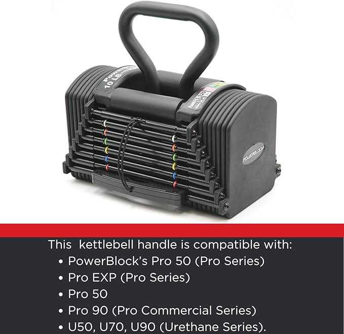- COMPATIBLE WITH OTHER POWERBLOCK PRODUCTS: This adjustable kettlebell handle is compatible with PowerBlock’s Pro 50 (Pro Series), Pro EXP (Pro Series), Pro 50 and Pro 90 (Pro Commercial Series), and U50, U70, U90 (Urethane Series).