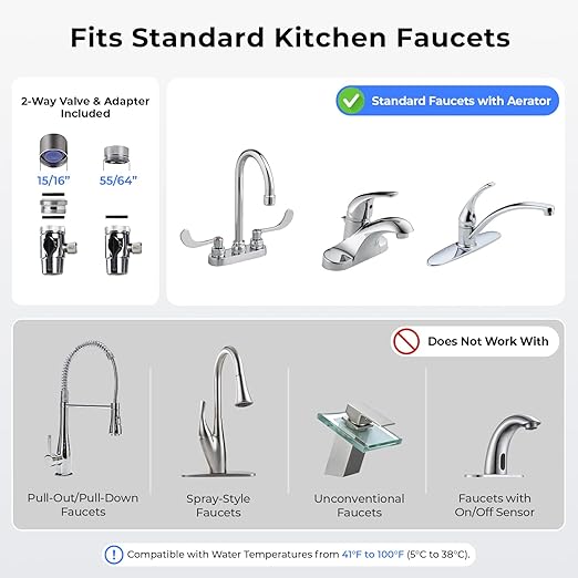 - Easy Installation: No drilling is required and no need for a plumber. The system easily connects to most standard kitchen taps and includes all necessary hardware (wrench and adapters). Switching between tap water and filtered water is simple with a switch twist.