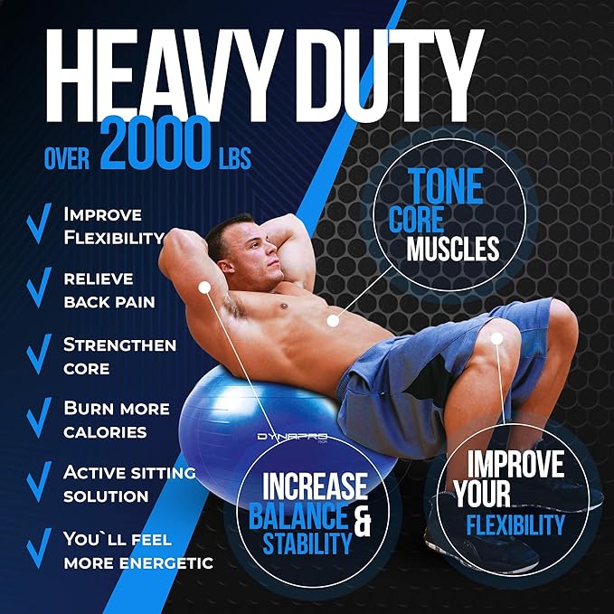 DYNAPRO Exercise Ball Extra Thick Eco-Friendly & Anti-Burst Material Supports over 2200lbs, Stability Ball for Home, Yoga, Gym, Birthing, Physio, Swiss, Physical Therapy or Pregnancy