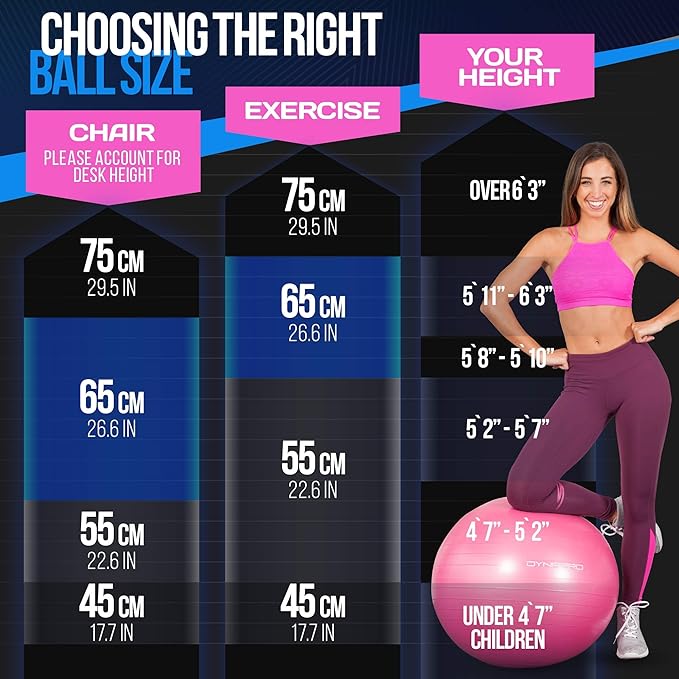 - FOUR SIZE OPTIONS FOR YOUR COMFORT AND SAFETY: 45cm, 55cm, 65cm, 75cm Not sure which is the right size for you? Our size guide helps you determine which size Exercise Ball best matches your intended use based on your body height if used for exercise, and the desk height if used as a chair.
