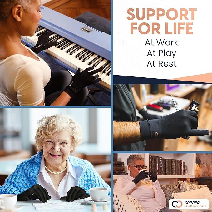 - FIND THE STRENGTH TO HEAL. Copper Compression's Arthritis Gloves provide you with the compression you need to help reduce swelling and pressure, increase blood flow, restrict excess fluid build-up, and relieve aching and soreness in joints. The therapeutic value of these full finger gloves provides support in managing medical conditions such as: arthritis, carpal tunnel, tendonitis, typing, texting, purlicue pain and repetitive stress injuries.