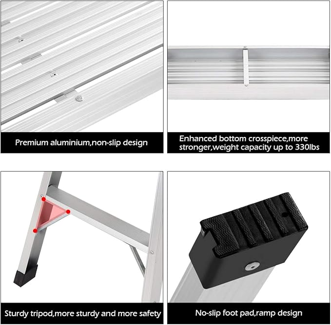 - 【Durable Construction】This step ladder is constructed with high strength aluminous which ensures the safety.
