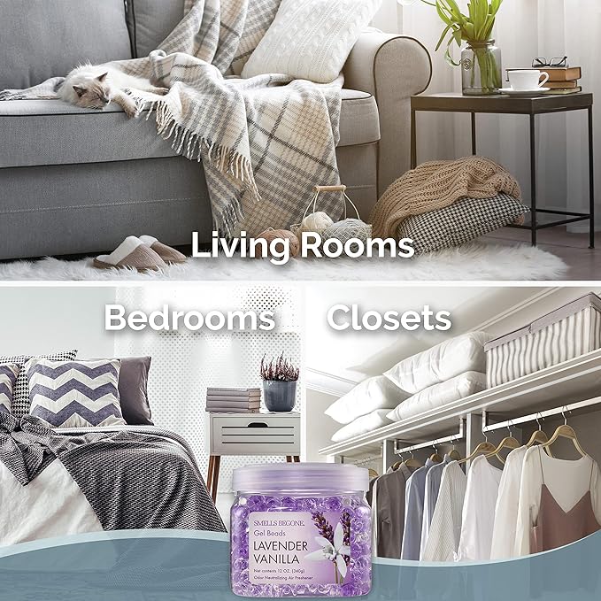 SMELLS BEGONE Odor Eliminator Gel Bead Value Pack - 72 oz - Air Freshener - Eliminates Odors in Bathrooms, Pet Areas, Boats, RVs & Cars - Made with Essential Oils - Lavender Vanilla Scent