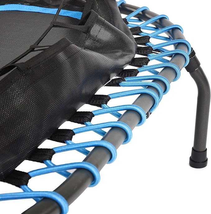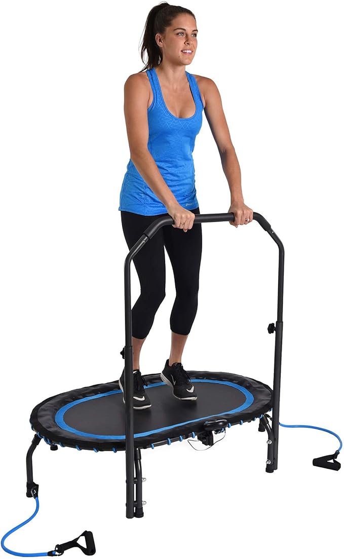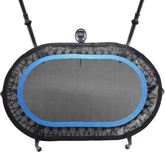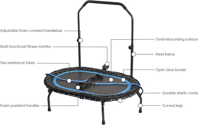- ADDITIONAL FEATURES: Oval-shaped, durable rebounding surface; Padded, height-adjustable support handlebar; Blue optic border with safety pad to protect feet and hands; Durable support legs
