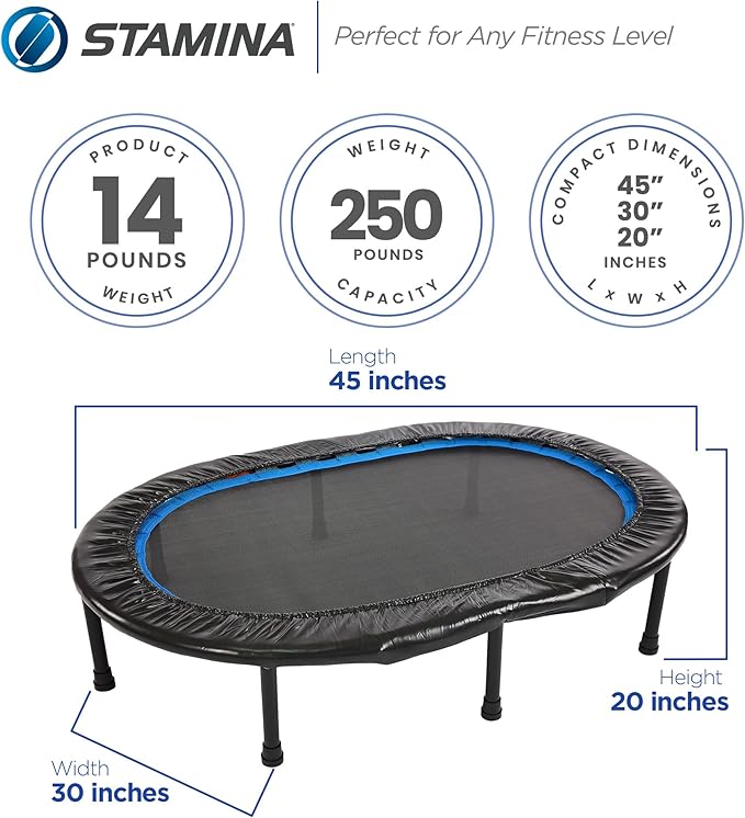 - Stamina's Promise: Backed by Stamina’s dedication to quality, this trampoline supports your fitness journey with every bounce. Experience the joy of bouncing into shape, professional brand support, and quality assurance included.
