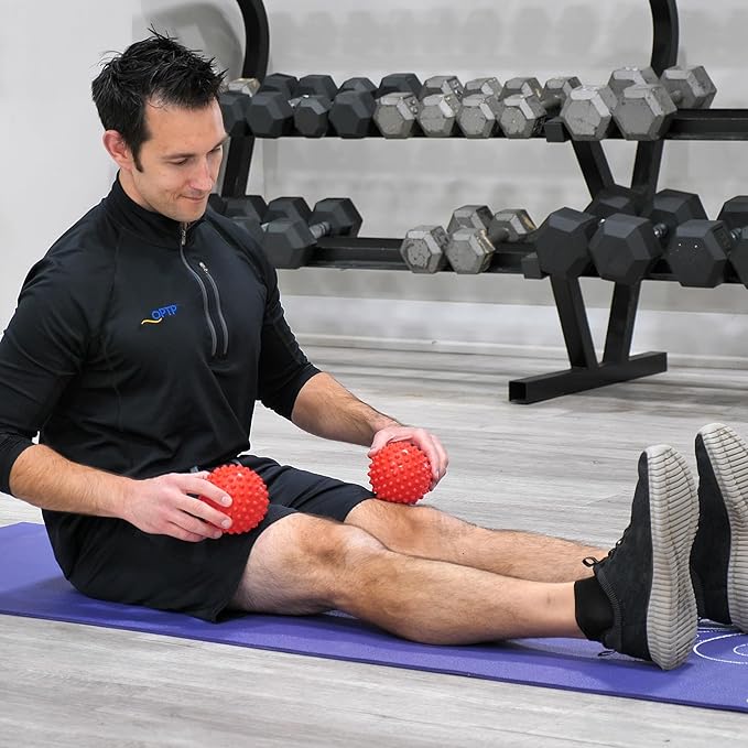 - Adjustable Firmness: This set of moderately spikey balls comes partially inflated. The level of firmness can be adjusted to best suit your level of comfort using the Needle Inflating Pump, available from OPTP.