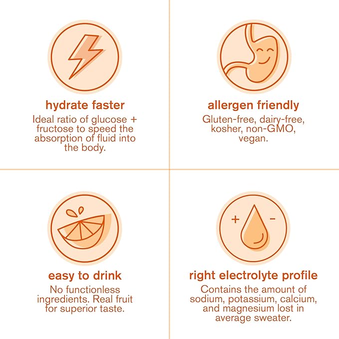 - Orange: Vegan, plant based, verified non-GMO, gluten free, dairy free and Kosher. Only real fruit used for flavor and a light, refreshing taste. 50% less sugar and nearly 2x the sodium of the leading sports drink*