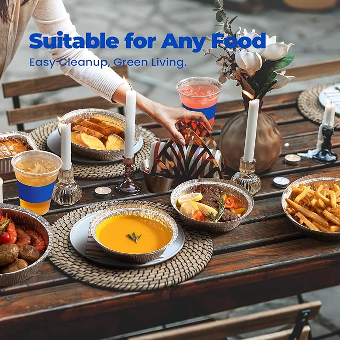 - Affordable Packaging: 50 pack 7 inch round aluminum pans disposable and 50 lids. Foil take out containers are stackable for easy storage and kitchen organization. They are a cost-effective option for restaurants, particularly for catering events or take-out orders.