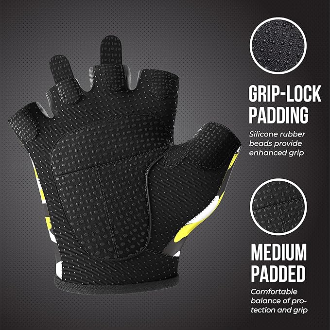 - π MEDIUM PADDED - GRIPLOCK PADDING - These gloves feature a comfortable medium foam padded palm which provides a balanced amount of protection and grip. Silicone rubber on the palm provides a grippy surface far superior to traditional leather.