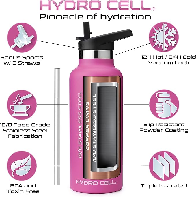 HYDRO CELL Stainless Steel Water Bottle with Straw & 2 Standard Mouth Lids (32oz 24oz 20oz 16oz) Keeps Liquids Hot or Cold w/Double Wall Vacuum Insulated Leak Proof Sport Design (Fuchsia 20oz)