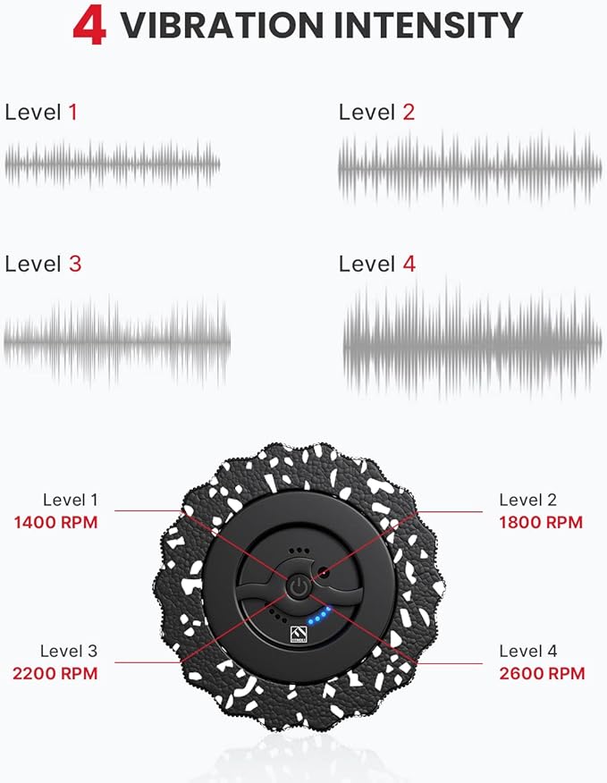 - [4 Vibration Intensity Levels] Experience tailored muscle relief with our back roller's 4 powerful vibration intensity settings. Whether you're targeting specific muscle groups or engaging in physical therapy, adjust the speeds from 1400RPM to 2600RPM to suit your needs