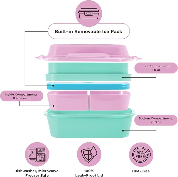- ADDITIONAL FEATURES: 100% Leak Proof Lid to prevent accidental spills. Freezer, Microwave and Dishwasher Safe (*after removal of ice pack*). Easy cleaning and storage.