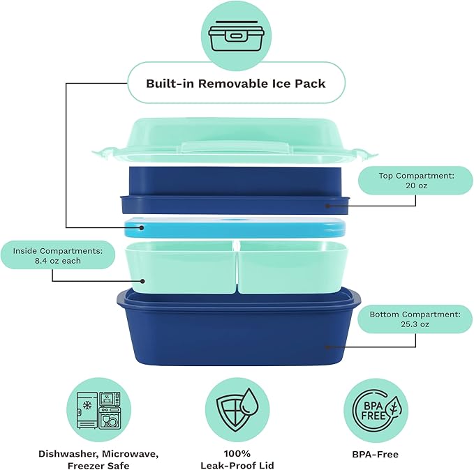 - ADDITIONAL FEATURES: 100% Leak Proof Lid to prevent accidental spills. Freezer, Microwave and Dishwasher Safe (*after removal of ice pack*). Easy cleaning and storage.