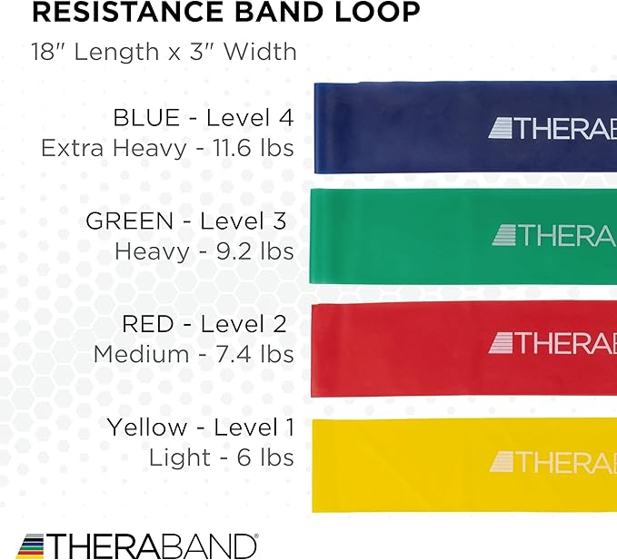 - Pack of four, 3 inch wide continuous loop elastic bands in the same colors and resistance levels as authentic THERABAND Progressive Resistance Bands