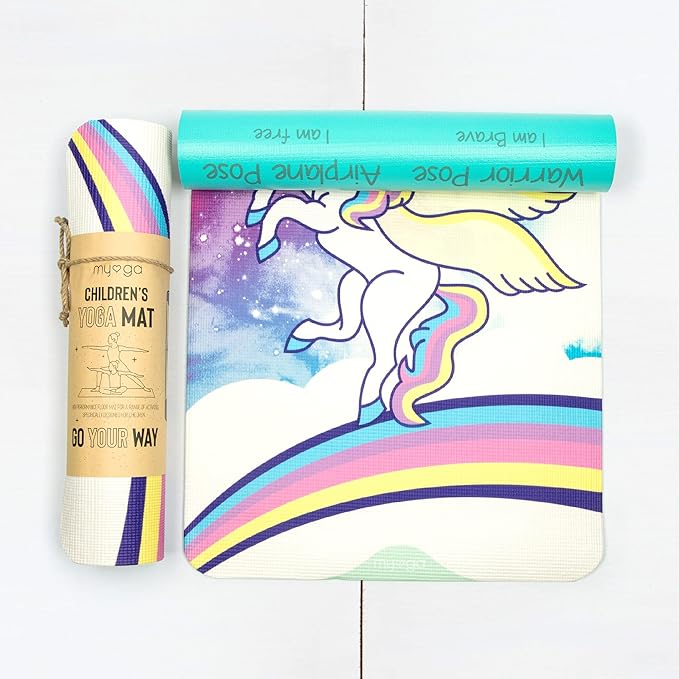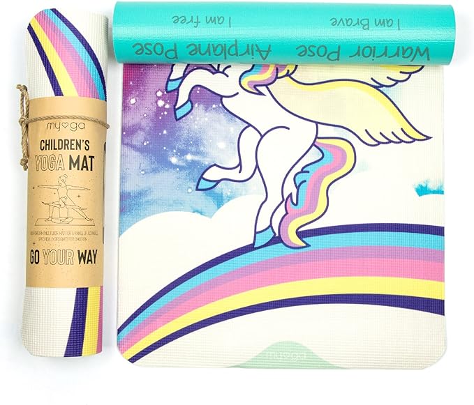 - EYECATCHING DESIGNS: The Myga Children’s Yoga Mat is the perfect way to spark your child’s curiosity and introduce them to yoga. Available in four colourful designs, and featuring 8 fundamental yoga poses on the reverse of the printed yoga mat, with a keyword and illustration for each pose making them easy to remember.
