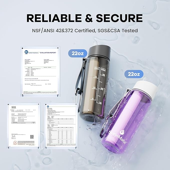 - 【5-Stage Filtration】:The Survimate water filter bottle adopts a composite filter technology, can reduce most contaminants. The filter element uses a coarse filter screen, a 0.01μm hollow fiber UF membrane, a sediment PP membrane, purification beads, and an activated carbon fiber to reduce chlorine, bad odor and intercept heavy metals, sediment, soil, organic matter and other impurities, etc.