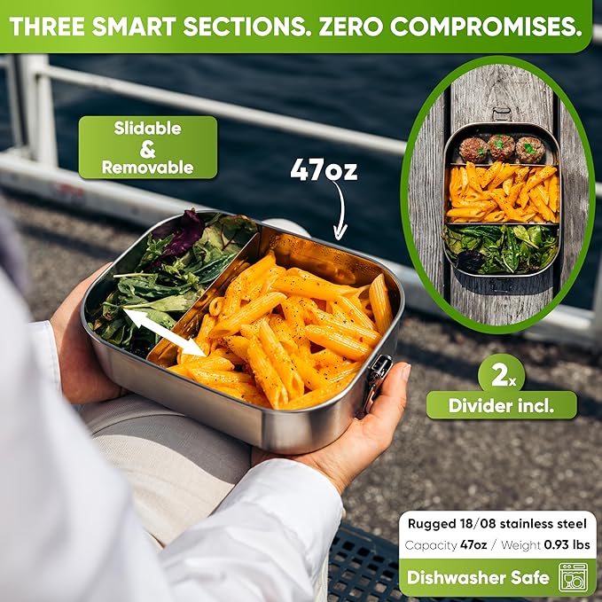 - SPACE-SAVING DESIGN: Maximize your meal prep with a bento stainless steel lunch box, featuring 3 compartments to keep your food organized! Please make sure to fill the compartments with enough food, that the Dividers stay in place. The stainless steel lunch containers adults are perfect for portion control and keeping your food separate.