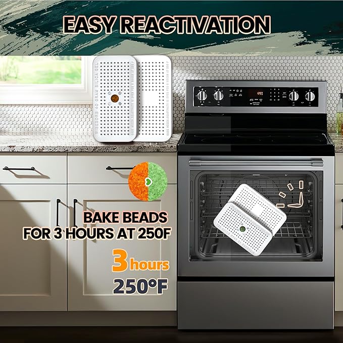 - 【Transparent Window & Easy Reactivation】: With the transparent window, you can easily monitor the color of the silica gel. If it turns from orange to light green, it indicates that the environmental relative humidity is above 50%. To reactivate the reusable silica gel canister desiccant dehumidifier, simply place it in the oven for 0.5 to 3 hours at 200°F to 250°F (avoid exceeding 250°F). The actual reactivation time may be shorter depending on the condition of the silica gel beads.