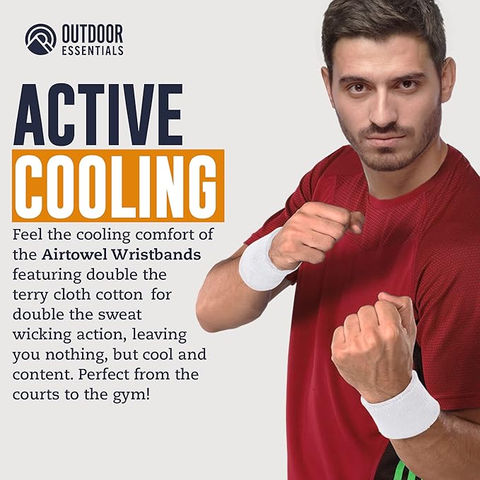 - ACTIVE COOLING COMFORT: Let our wrist bands wick sweat to cool you down, so you can perform your best. Our premium arm sweat bands are made from a super soft, stretchy, and absorbent material. Made with 78% Cotton, 12% Elastic, 10% Nylon blend that looks cool and stays put so you can feel fresh and stave off the sweat during any activity. Perfect from the courts to the gym!