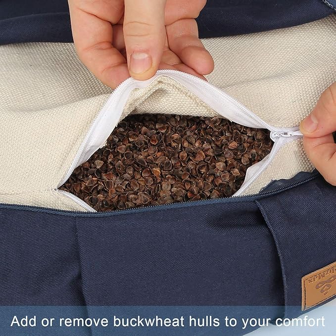 - CONVENIENT. Each zafu meditation cushion/pillow has sturdy carry handle for easy transport. The enough buckwheat hulls filling can be added or removed from zipper access to find the optimal level for your body. Organic cotton cover of Yoga bolster can be machine washed with cold water to reduce the risk of shrink or fade.
