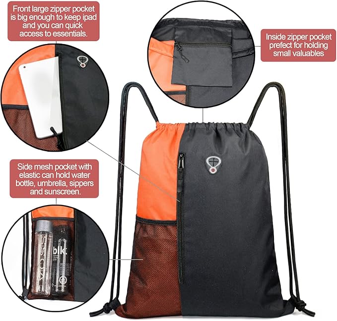 - CONVENIENT MULTI POCKETS: 20" tall full length and 10" width front large zipper pocket is perfect for keeping odds & ends handy without digging through the entire athletic bags. An extra inside zipper pocket measures 7 " x 7", big enough for holding small valuables such as sports watch, wallet, cellphone to avoid any pickpockets. Another Side mesh pocket with elastic on the front of the string backpack can hold the water bottle, umbrella, sippers, and sunscreen.