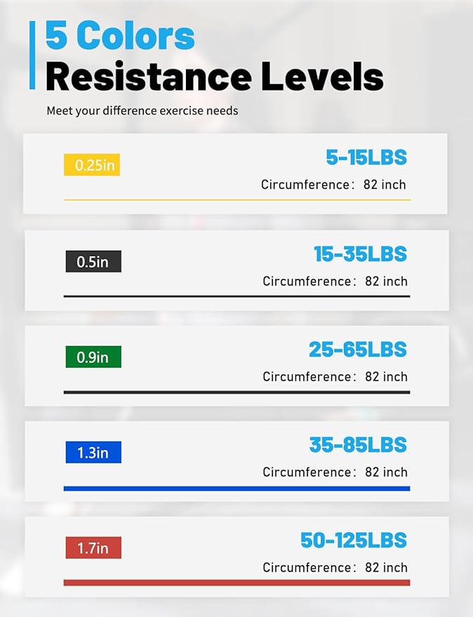 - For All Strength Level: With 5 different strength levels Orange:5-15 lbs., Black:15-35 lbs., Yellow:25-65 lbs., Blue:35-85 lbs., Red:50-125 lbs, these exercise bands will help you upgrade your fitness training from a newbie to a veteran. These fitness bands can be used alone or combined multiple workout bands to increase the challenge. Start now and build your dream body