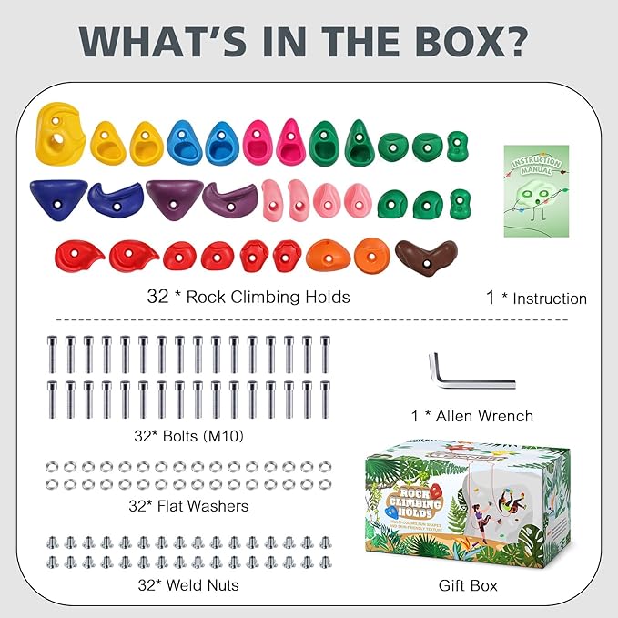 - 2 Inch Hardware Included: Kit includes 32 various color climbing rocks, 32 2'' Bolts(M10), 32 Flat Washers, 32 Weld Nuts and Hexagon Wrench, designed to be mounted on boards up to 1-1/4 inch thick