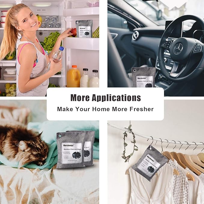 - Perfect for Any Where- The incredibly powerful type of charcoal has millions of tiny little pores and cavities that work together to clean the air and absorb the excess moisture; The bamboo charcoal neutralizes even stubborn smells such as those caused by smoke, pet urine, cat litterboxes, wet dogs, gym shoes and more.This makes bamboo charcoal to be the perfect air freshener and odor remover.