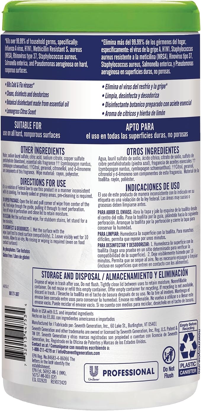 Seventh Generation Professional Disinfecting Multi Surface Wipes, Lemongrass Citrus, 70 count Tubs (Pack of 6)