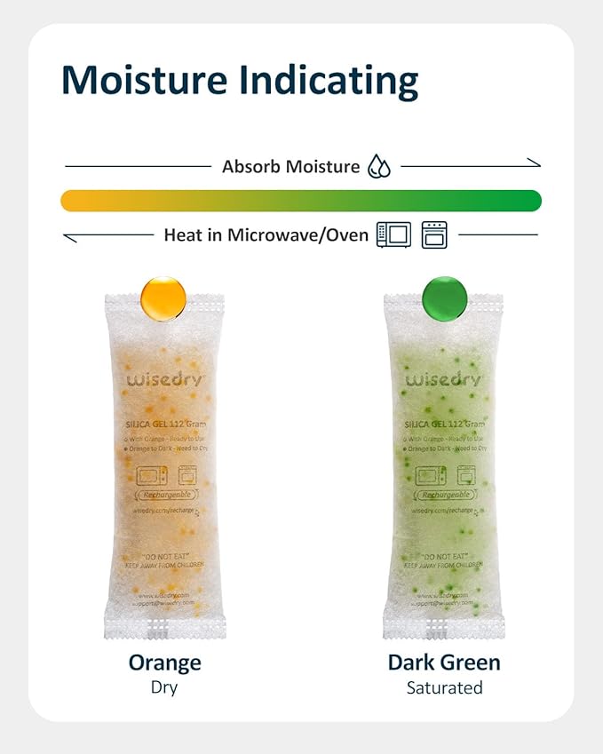 - ✅ - [ Moisture Indicating Desiccant] - Contains orange indicating silica gel that enables users to quickly determine when desiccant needs to be recharged or replaced, the orange beads will change their color gradually from orange to dark green (saturated). After recharge, dark green beads will turn back to orange.
