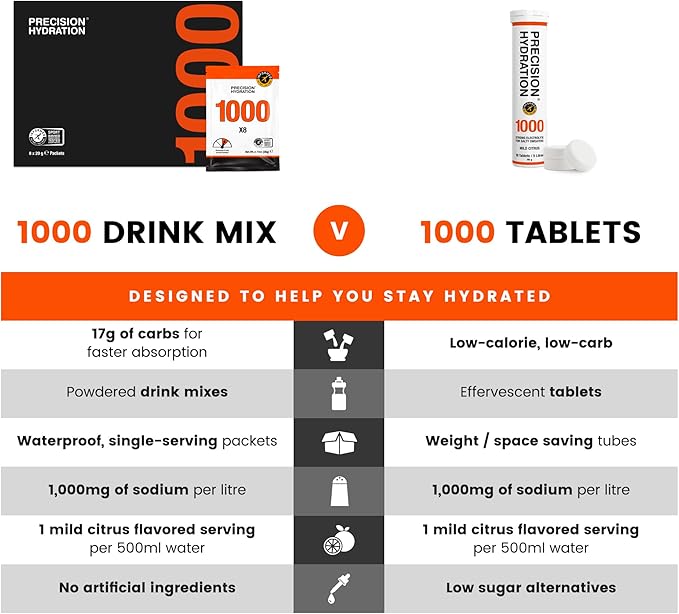 Precision Hydration Electrolyte Powder - No Artificial Ingredients, Multi Strength Hydration Packets - Individual Waterproof Servings - Gluten/Dairy Free, 1 Box (8 Packets, 1000mg/L-Orange)