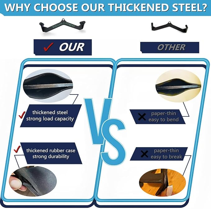 - Made of high-quality and 13mm thickness steel and coated with a super tough, washable, chip and scratch-resistant textured rubber 6mm thickness, Total thickness 19mm, Maximum load capacity is 1200 pounds, YIXUAN FITNESS lat pull down bar will not chip or scratch your expensive machines like conventional handles