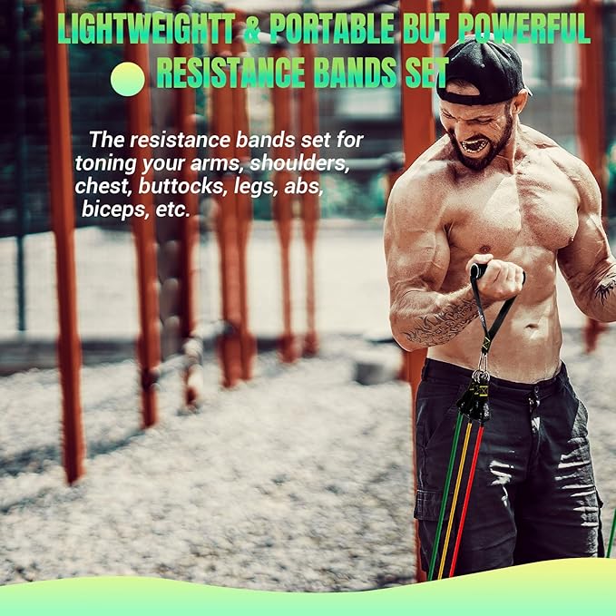 - [Perfect Workout Set & Brand Service] Our resistance bands set with door anchor contains 5 latex tubes in different colors, 2 cushioned handles, 2 ankle straps, 1 Training Poster, 1 carrying bag, and 1 exercise guide. We stand by our resistance bands set with our outstanding customer service, If you have any problems, please don't hesitate to contact us.