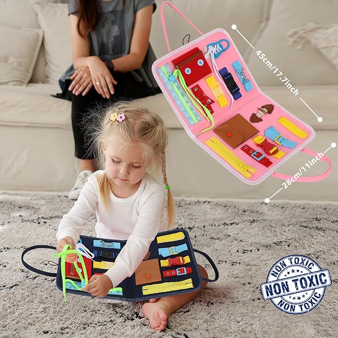 - [SOFT & PORTABLE]: Made of toxic-free soft fabrics and felt, our sensory board is soft enough to avoid harming your active toddler when being thrown. Lightweight(0.5 LBS) enough busy board with a handle for toddlers to carry and flexible to fit in most diaper or school bags. Great toddler activities sensory board to eliminate boredom while on car, airplane, travel or settings needing quiet.