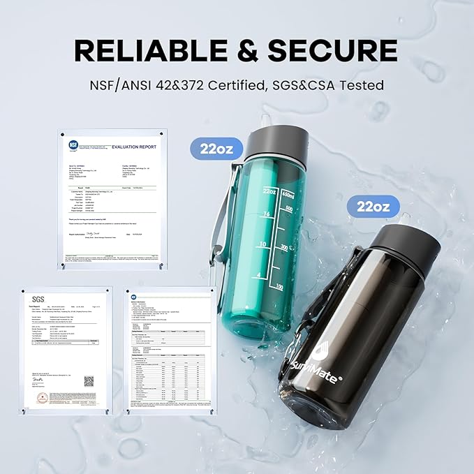 - 【5-Stage Filtration】:The Survimate water filter bottle adopts a composite filter technology, can reduce most contaminants. The filter element uses a coarse filter screen, a 0.01μm hollow fiber UF membrane, a sediment PP membrane, purification beads, and an activated carbon fiber to reduce chlorine, bad odor and intercept heavy metals, sediment, soil, organic matter and other impurities, etc.