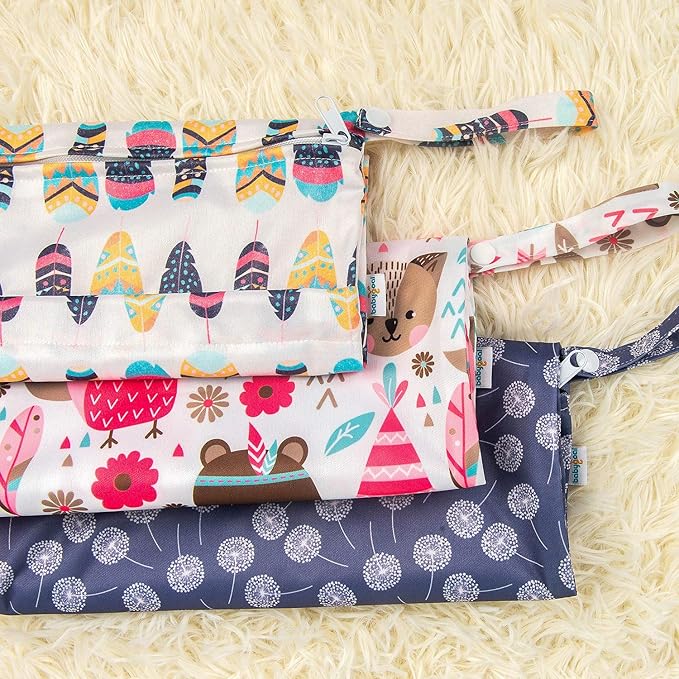 - Double-Pocket Design with Snap Handle: Each wet bag contains two pockets, which comes with two zip closures to ensure that nothing will drop out of the bag and better to keep the clean and dirty items separately. With the snap handle design, you can unbutton the haddle and easily hang the bag on the stroller or door knobs, towel rod ect. anywhere you want.