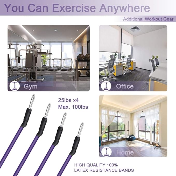 - 【ADJUSTABLE STRENGTH】We provide 4 resistance bands helping to adjust the strength of exercise, each pull rope has around 25 lbs of tensile strength. Multiple bands make for different weight training. You can combine the bands to achieve the desired effect. This kit is suitable for beginners and fitness enthusiasts at different stages. It is perfect weight loss equipment for women.