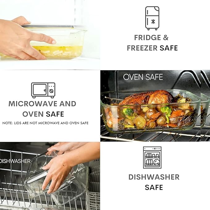 - Leak Proof Storage: Container set Is Easily Sealed, Air Tight And Spill Proof - Rectangle GLASS FOOD CONTAINERS- Keep Leftovers Fresh, Goes Straight From The Refrigerator To The Microwave Or Oven To The Table. Food Can Be Cooked Directly In The Containers Using Microwave Or Oven. Less dead space while storing in refrigerator due to Rectangle shape.