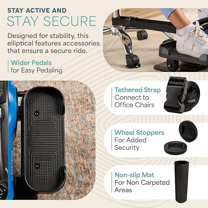 - ALL-IN-ONE KIT: Our FlexStride Plus comes with an exercise mat, tether strap, yoga resistance band, and wheel stoppers for added stability. This full set transforms your ellipse leg exerciser as seen on TV into a complete solution.