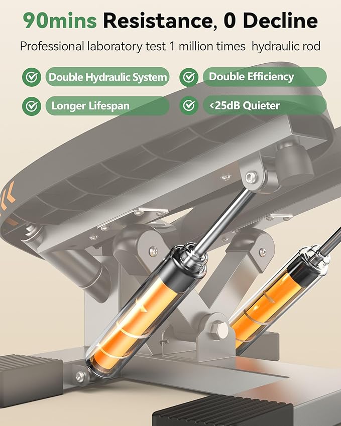 - [90MIN Continuous Resistance]Built with a European standard hydraulic cylinder strengthen, this twist stepper will maintain high resistance in each exercise cycle to help you burn fat quickly. After 100k cycle hydraulic test, the resistance can last for up to 90 minutes,and excellent gas sealing will no oil leakage.
