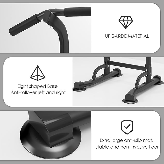 - 💪【Multi-functional】Multi-station exercise station for performing different workouts. You can easy to Chin up, Dips, Vertical Knee Raises, Push-ups and Reverse grip chin up whenever and wherever possible. Easy to training abdominal muscles,arms,back,chest,shoulders and leg muscles.