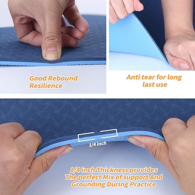 - 🧘♀️【Durable and Spacious TPE Yoga Mat】Our yoga beginners kit includes a premium TPE yoga mat with double-sided non-slip surfaces and two color options. Measuring 72"L x 24"W, it provides ample space and a 6mm (1/4in) thick for optimal comfort and support. The fast rebound technology reduces impact force, protecting your joints while maintaining stability.