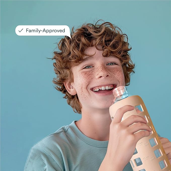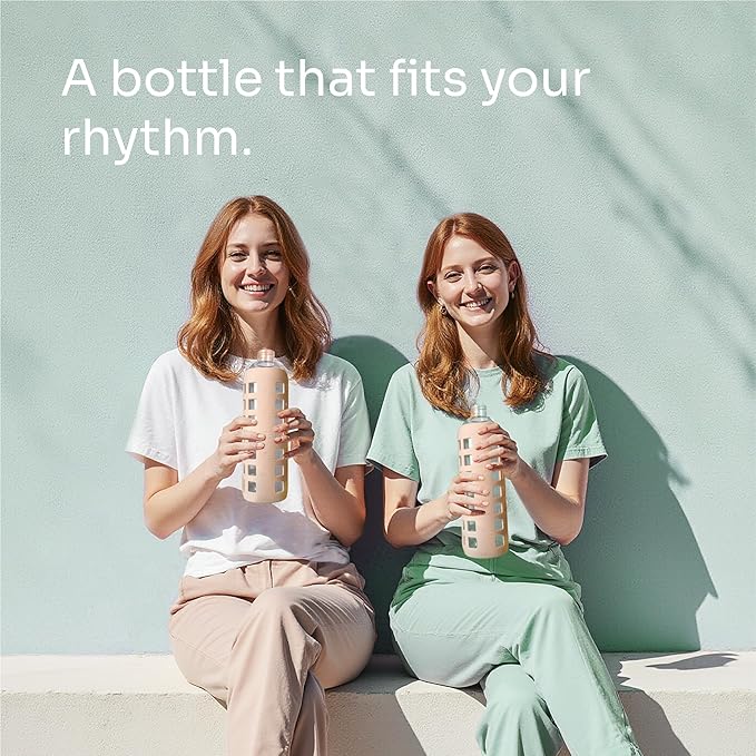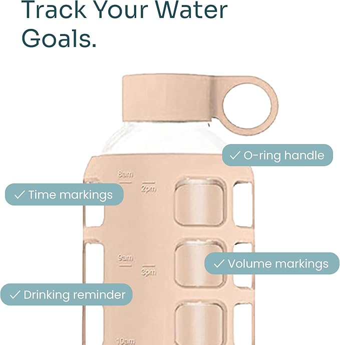 purifyou 40oz / 32oz / 22oz / 12oz Borosilicate Glass Water Bottle with Time & Volume Markers, Silicone Sleeve, Stainless Steel Lid | Reusable Glass Bottle for Water & Juice (32oz Hazelnut)