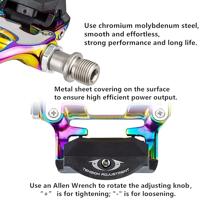 - 【QUALITY MATERIALS】 Pedal uses electroplating process, beautiful look and not afraid of rain. Bike pedals and cleat set [body] aluminum alloy, [axis] chromium molybdenum steel. The protective cover is made of wear-resistant rubber. Each pedal weighs approximately 150g / 5.3oz.
